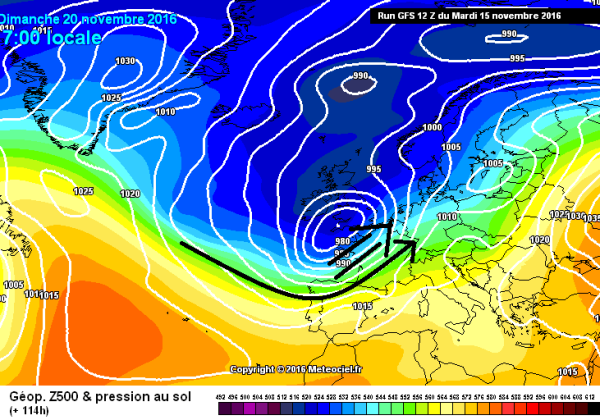Résumé : ce dimanche, un vaste système dépressionnaire va s'étirer de la Scandinavie au proche Atlantique. Cette dépression, peu mobile et très dynamique, va favoriser la mise en place d'un flux marin sur l'arc méditerranéen...