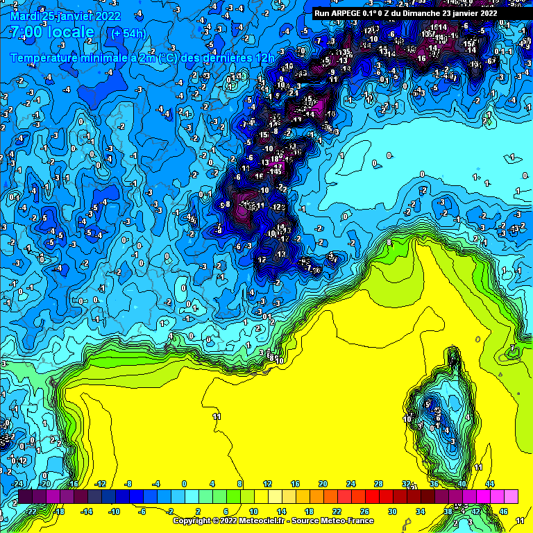 La situation sera assez semblable mardi matin avec des gelées blanches nombreuses et localement marquées sur les secteurs où le ciel est dégagé tandis que des nuages bas pourront garder une températures positive là où ils sont nombreux. Ces brumes pourraient être moins nombreuses mercredi et jeudi avec des gelées qui en profiteront pour gagner encore plus de terrain. Encore une fois, ces gelées ne sont pas du tout exceptionnelles pour la saison mais elles entretiennent un ressenti hivernal avec souvent -2 à -5°C dans nos plaines, parfios -7 ou -8°C dans l'arrière-pays.