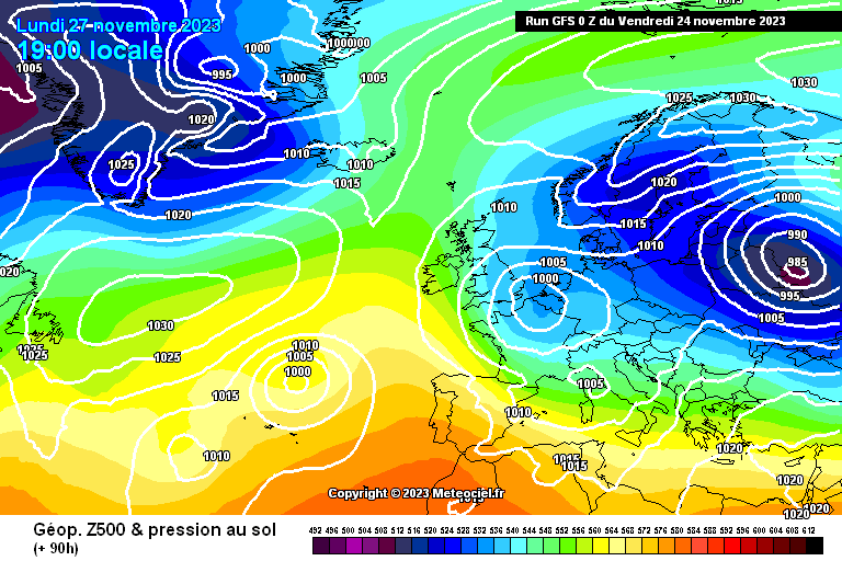 Analyse météorologique de ce 24 novembre 2023. La France est actuellement sous l'influence de la dorsale anticyclonique qui s'étire entre les Açores et l'Irlande et qui déborde largement sur notre pays, pour une courte durée toutefois. Ce rebond des pressions a induit une hausse des températures ce vendredi, mais cela ne va pas durer. Dès demain vendredi et pour le week-end à venir, les hautes pressions vont remonter vers l'Islande. Dans le même temps, un décrochage polaire associé à des basses pressions et de l'air bien plus froid s'organise par la Scandinavie.