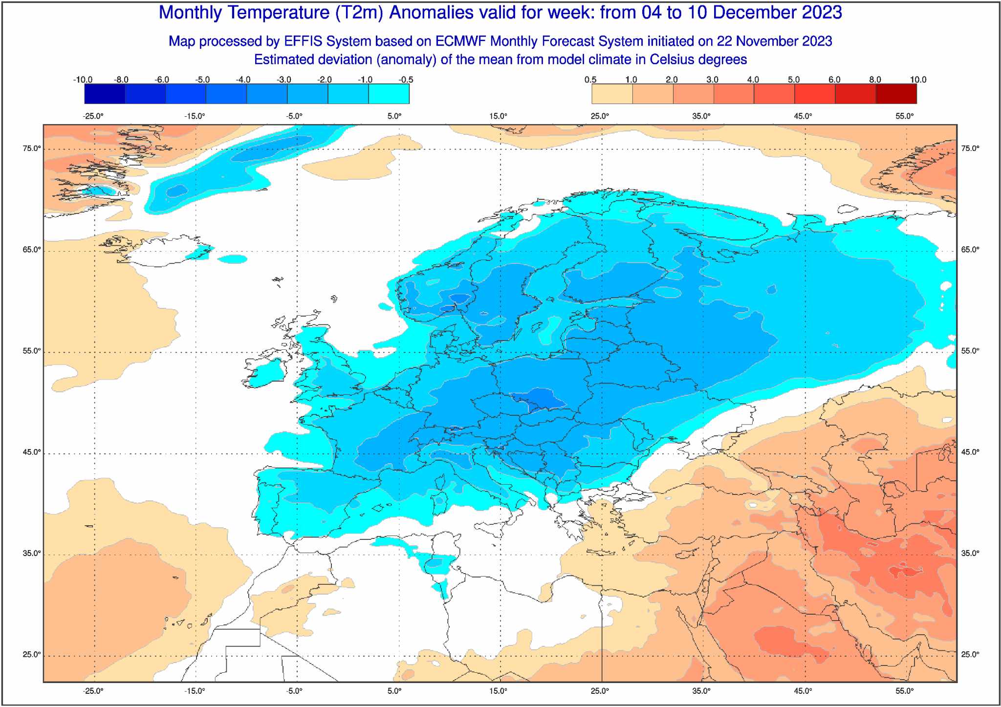Pour rappel, retrouvez ci-dessous les projections du modèles saisonnier CEP pour début décembre. Lui aussi est en faveur de températures se situant nettement sous les normales saisonnières. Ce n'est pas gage de certitude, mais c'est significatif dans cette période de réchauffement climatique. A bientôt pour vos prochains articles...
