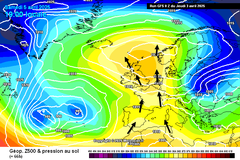 Ce jeudi, une goutte froide dépressionnaire circule entre les Açores et le Portugal. Elle est trop éloignée pour véritablement nous impacter mais engendre un temps agité entre Portugal et l'Ouest de l'Espagne. Un anticyclone s'étire de l'Algérie à la Scandinavie en passant par l'Italie et l'Allemagne. Pour la fin de semaine et le week-end à venir, la France va demeurer sous l'influence de l'anticyclone. Il y aura à l'Ouest (sur l'Atlantique) une anomalie dépressionnaire peu dynamique et à l'Est une goutte froide bien plus dynamique mais circulant autour de l'Ukraine sans nous menacer.
