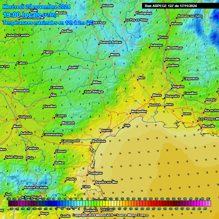 Maximales de 14/15°C sur l'Est du Languedoc mais 17°C sur l'Aude et jusqu'à 20°C à Perpignan. Mercredi, on passe à l'étape supérieure... de façon très progressive. Le flux de nord-ouest se dynamise et entraîne une accentuation du mistral et de la tramontane. Soleil prédominant en journée sur les plaines, mais les nuages vont se mutliplier le soir à l'avant d'une perturbation qui va être à surveiller en raison d'un risque de neige à basse altitude (PAS EN PLAINE) la nuit suivante. Maximales de mercredi : autour de 10/12°C du Languedoc au Roussillon :