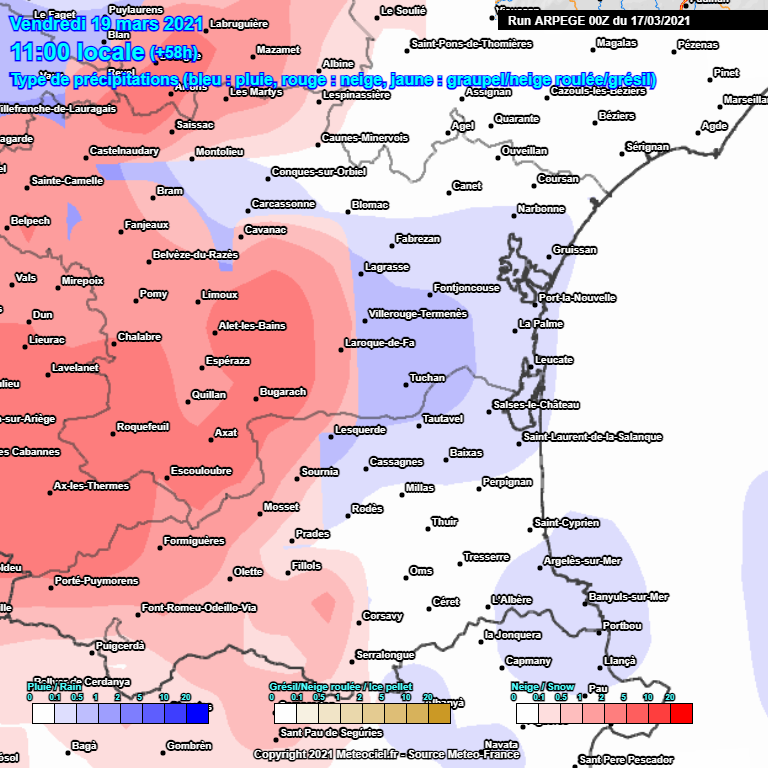 Dans cette configuration, le temps est moins perturbé que si elle était passée sur le centre du pays. Mistral et tramontane vont persister et seront de plus en plus froids. De l'air froid en altitude (-4 à -6°C à 850 hPa soit 1500 mètres) va s'engouffrer sur notre région. Cela va tout de même générer une dégradation. Elle restera atténuée sur de larges secteurs mais elle pourrait être un cran plus dynamique entre Aude et Pyrénées-Orientales. C'est d'ailleurs sur ces territoires où le risque de neige à basse altitude est le plus présent pour la journée de vendredi.