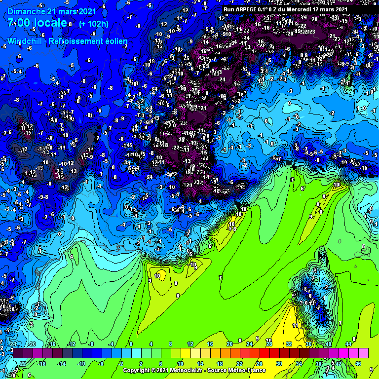 Ailleurs, les précipitations auront du mal à s'organiser pour faire baisser la limite pluie-neige. Si le ressenti ne sera pas agréable entre les averses, le vent et les températures en baisse, la situation ne se prêt pas à de la neige en plaines. La Provence pourrait être plus à surveiller et notamment l'Ouest du Var où la neige pourrait également tomber dès 400 ou 500 mètres d'altitude. La chute des températures conjuguée au maintien du vent et à la multiplication des nuages donnera un ressenti bien hivernal. Exemple ci-dessous avec les températures ressenties au vent pour dimanche matin sur la région :