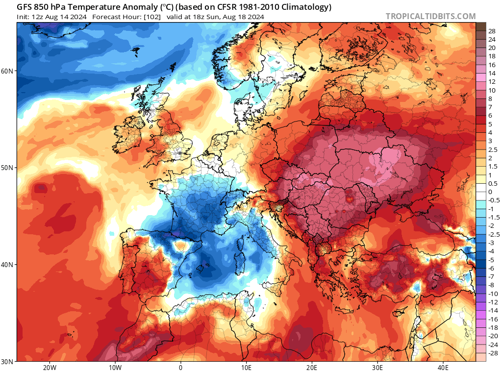 Alors non, ce n'est pas l'hiver avant l'heure ! La couleur bleue de la carte ci-dessus pourrait faire croire à de l'air très froid mais il s'agit d'une anomalie par rapport à la moyenne. Cela montre que nous pourrions avoir temporairement des températures sous les moyennes de saison. La journée la moins chaude devrait être vendredi.