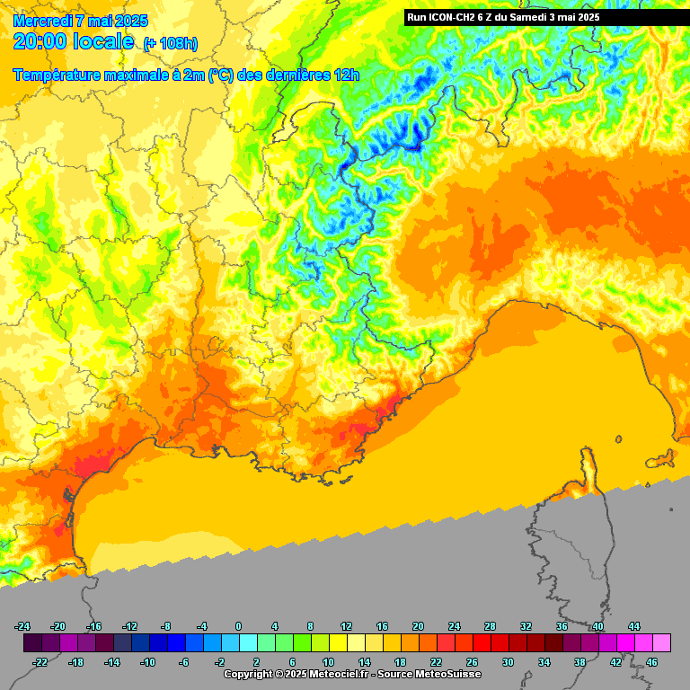 Jeudi 8 mai, sous un ciel dégagé, on verra la réapparition des gelées en Lozère et les campagnes seront également très fraîches le matin (parfois autour des 4°C dans des conditions déventées). "En mai, fais ce qu'il te plaît", mais avec du bon sens tout de même ! Les maximales restent stationnaires par rapport aux journées précédentes. Dès vendredi, avec le gonflement de l'anticyclone, on pourra connaître une hausse du thermomètre avec 21/22°C, loc. 23°C sur la plaine. Pour le week-end, la hausse du thermomètre continue sur sa lancée, avec le retour des 25°C sur les plaines.