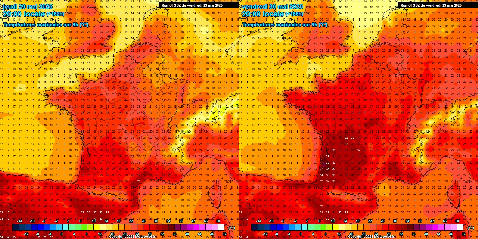 En deuxième partie de semaine, la chaleur devrait franchir un nouveau cap. Avec un nouveau gain des hautes pressions par le Sud, ce sont des conditions pleinement estivales qui sont attendues. Les modélisations ci-dessus ne sont pas à prendre au pied de la lettre mais nous devrions très probablement dépasser les 30°C. Des pointes à 32-33°C sont tout à fait possibles. Rappelons que les records pour un mois de mai sont de 34,7°C pour Nîmes ou encore 35,1°C à Montpellier.