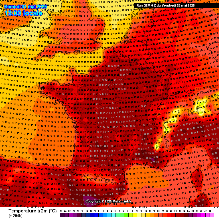 Conséquence directe de ces conditions plus stables, aucune pluie n'est entrevue à moyen terme. De rares averses ne sont pas exclues sur nos reliefs très localement mais en plaines c'est bien un temps sec qui est modélisé jusqu'à la fin du mois. Outre l'absence de pluie, les températures vont progressivement monter pour se rapprocher de la barre symbolique des 30°C.