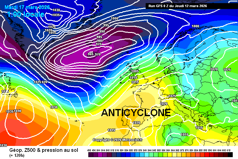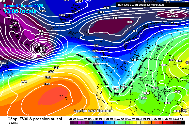 Nous sommes ce jeudi 12 mars 2026 à mi chemin entre un anticyclone assez fragile, lui positionné entre les Açores et l'Espagne, et les basses pressions qui circulent entre le Groenland, l'Islande et le nord de l'Angleterre. L'anticyclone nous protège temporairement des perturbations nous offrant même une période ensoleillée de 36h environ. Demain vendredi, l'anticyclone regonfle sur les Açores mais se rétracte de notre pays. Une poche dépressionnaire s'abaisse de l'Angleterre au nord de la France.