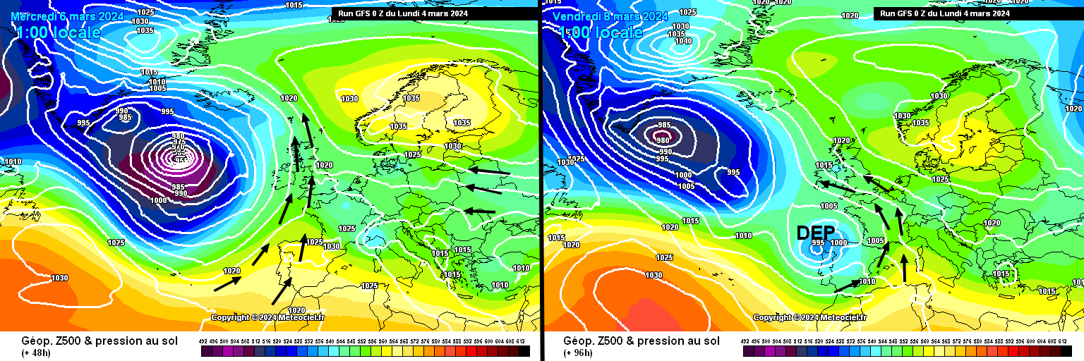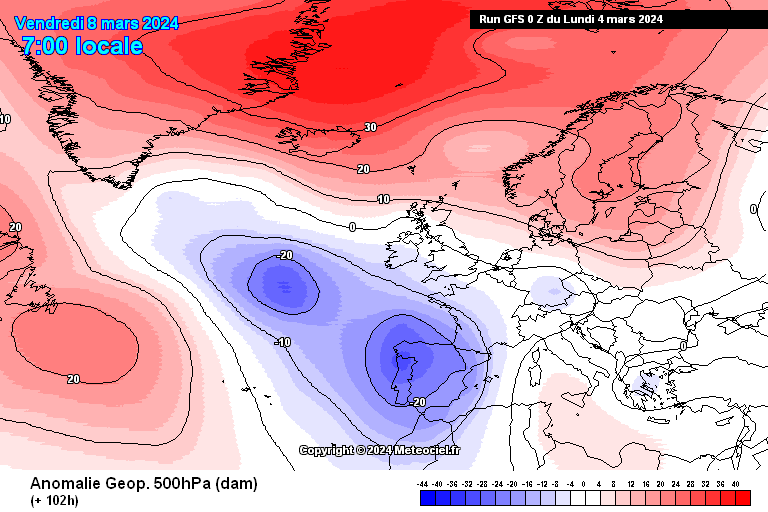 Il y a globalement une bonne unanimité des modèles à voir la circulation dépressionnaire glisser du Groenland vers l'Espagne d'ici vendredi 8 mars. Dans ce contexte, le flux va se soulever au secteur sud à un moment ou un autre, favorisant la dégradation en question. Toutefois, l'emplacement exact du couloir dépressionnaire reste à affiner. S'il se décale vers le nord (sur un axe Aquitaine / Massif-Central) il s'agira d'une dégradation de faible intensité. A contrario, si une goutte froide s'isole sur l'Espagne, une dépression pourra se constituer en Méditerranée favorisant une dégradation plus forte que ce qui envisagé pour le moment.