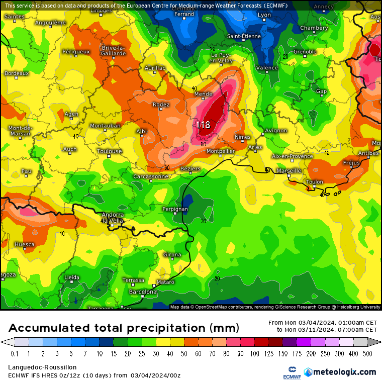 Sur la base des modélisations actuelles, une dégradation active est susceptible de se produire autour de vendredi. Nous misons pour le moment sur une faible activité du Roussillon au Biterrois en passant par l'Aude (quelques mm) mais de précipitations plus marquées toujours sur l'Est de l'Hérault, le Gard et la Lozère. Avec la persistance de l'air frais en altitude, il devrait s'agit de chutes de neige significatives au-dessus de 1000 à 1200 m de l'Aigoual à la Lozère.