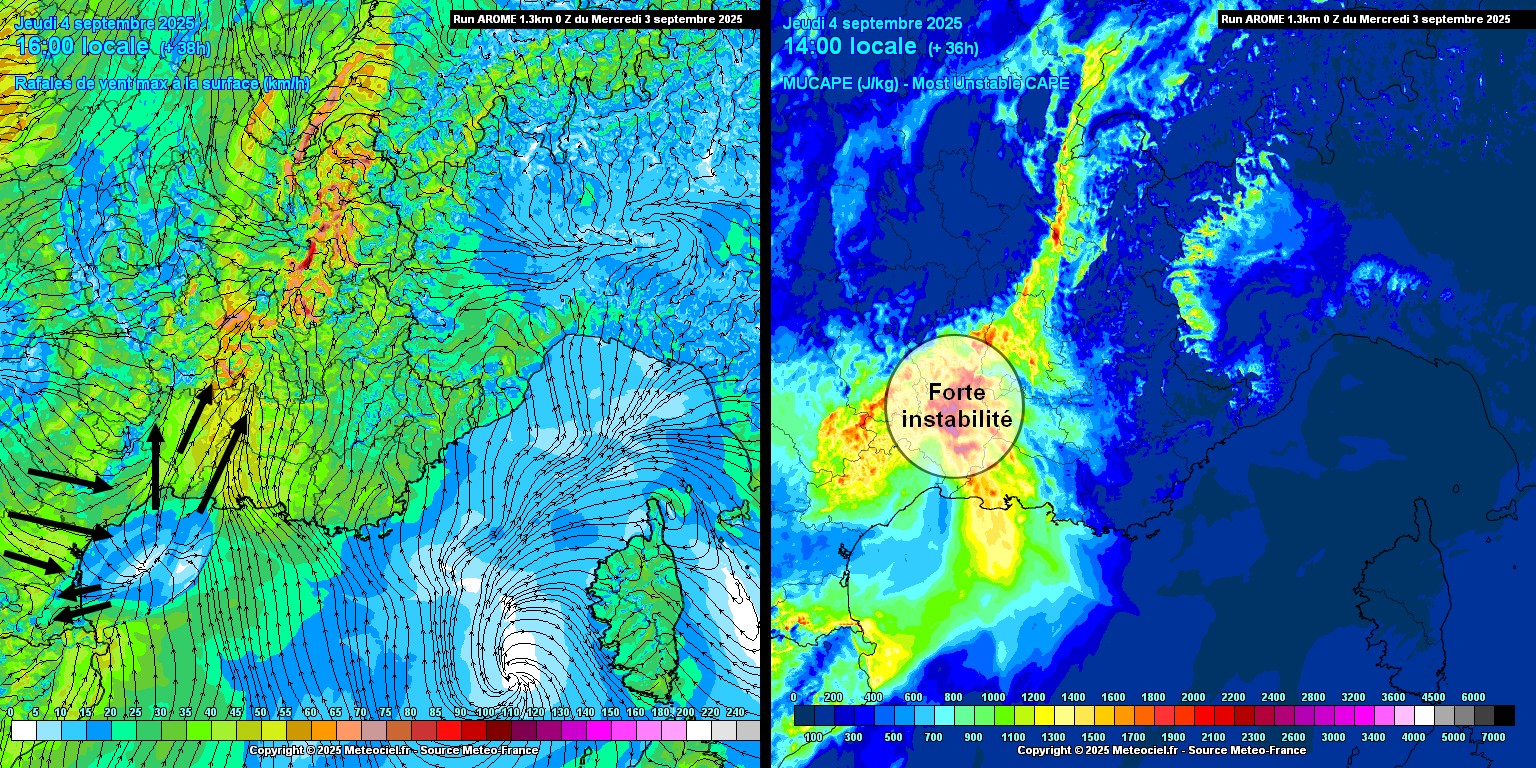 Ce jeudi, dès les premières heures de la journée, il faudra s'attendre à un ciel gris la présence d'entrées maritimes. Sous ces nuages, de la bruine ou quelques ondées sont possibles en matinée notamment entre l'Est de l'Hérault et le Gard. C'est surtout dans l'après-midi que l'instabilité va être en hausse. Si des éclaircies arriveront à se former entre les nuages marins en milieu de journée, cela ne fera qu'augmenter la réserve d'énergie disponible pour les orages. Dans une ambiance bien lourde, les premiers orages vont rapidement se développer entre Lozère et Ardèche.