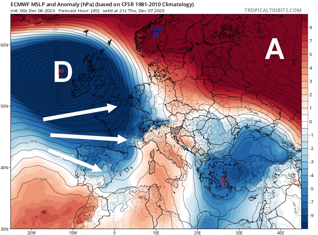 Après une période assez fraiche, sous les normales de saison, un changement de temps se met en place. Nous étions placés sous un flux de Nord apportant cet air froid venant du Nord de l'Europe. L'activité dépressionnaire se renforce sur l'Océan Atlantique tandis que l'anticyclone des Açores va s'installer sur l'Espagne. Dans ces conditions, nous allons être sous l'influence d'un flux d'Ouest plus doux mais aussi bien plus agité. Cela commence dès ce jeudi avec un talweg assez profond et dynamique.
