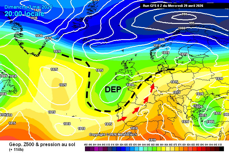 Le passage au mois de mai approche. Vendredi et samedi, la pulsion anticyclonique va momentanément se renforcer entre l'Afrique, la France et l'Europe du Centre/du Nord. Un talweg dépressionnaire va se constituer sur le proche Atlantique, entre l'Irlande, le golfe de Gascogne et le nord de l'Espagne. Il sera cette fois plus dynamique que les précédentes anomalies et probablement plus proche aussi. Cela va dans le sens d'orages pouvant gagner du terrain entre la fin de week-end et le début de semaine prochaine. Ci-dessous, voici la synoptique météorologique attendue lundi :