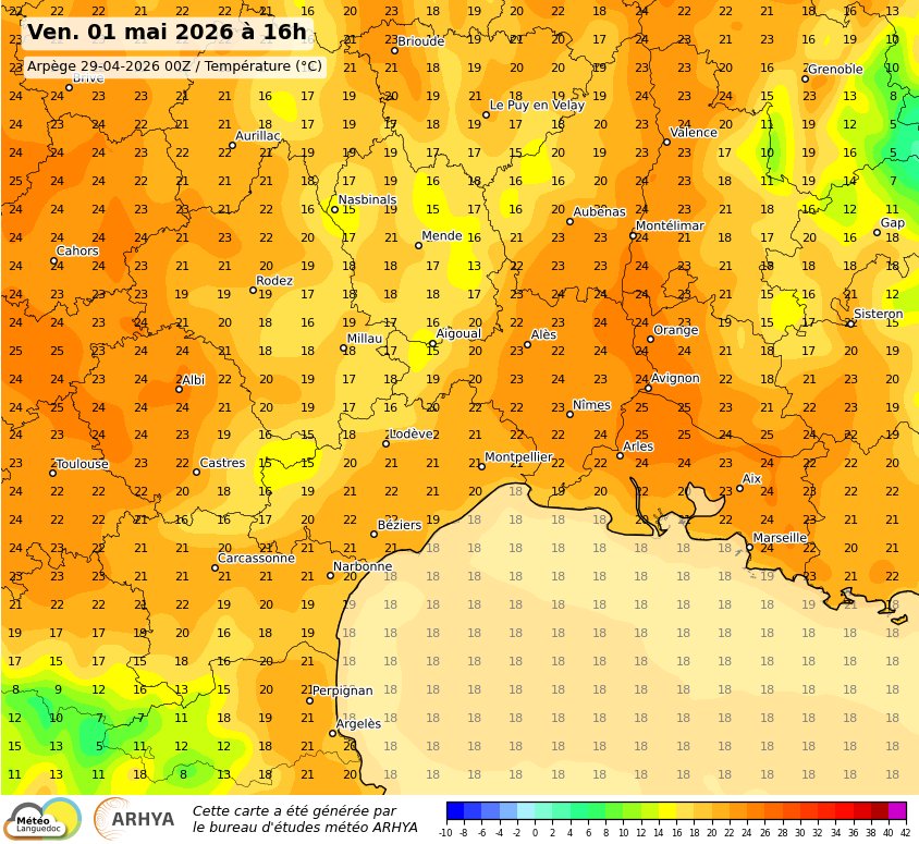 Éventuellement, nous surveillerons le risque d'orages un peu plus structurés sur les montagnes Pyrénéennes. Ce risque d'averses/d'orages est attendu entre l'après-midi et la nuit suivante. Sous les nuages, les maximales sont sans grande évolution avec 21/23°C sur le Roussillon, l'Aude, l'Hérault et l'Ouest Gard, 24°C près du Rhône. Autour de 13/14°C sur les plateaux de Lozère. Vendredi, encore des nuages le matin puis la hausse des pressions atmosphériques va favoriser le retour du soleil l'après-midi. Les températures maximales se rapprochent de 21/22°C entre les Pyrénées-Orientales, l'Aude et l'Hérault, 23/24°C près du Pic Saint-Loup, 24/25°C sur le Gard et la vallée du Rhône. Jusqu'à 20°C dans les vallées Lozériennes.