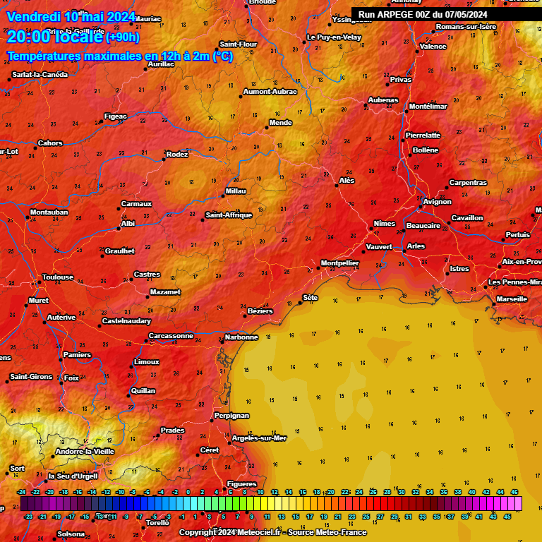 Nouvelle hausse des températures avec des maximales proches de 26 à 27°C sur l'ensemble de nos plaines. Entre vendredi et samedi, les conditions ensoleillées se maintiennent. On note uniquement la présence de quelques fins nuages élevés. Le vent est faible avec un petit vent de nord/nord-ouest le matin, puis de petites brises marines l'après-midi. Les températures maximales peuvent progresser d'un cran avec des maximales de 27 à 28°C sur nos plaines, localement 29°C près du Gard/vallée du Rhône.