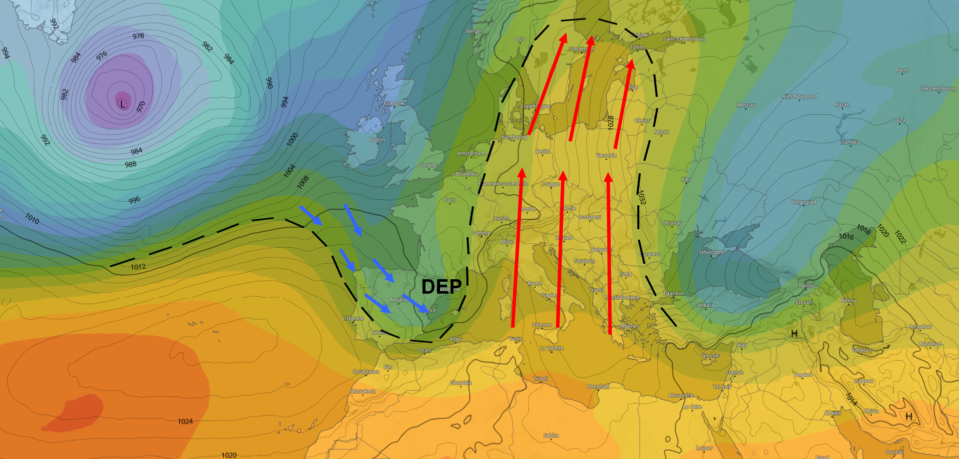 Un système dépressionnaire se développe actuellement entre l'Islande et les Açores en plein centre de l'Atlantique. Une petite dorsale anticyclonique s'étire entre la Tunisie et l'Italie, mais elle tend à se décaler rapidement vers l'Est en direction des Balkans. C'est donc peu à peu le système dépressionnaire Atlantique qui va l'emporter et se rapprocher de la France. Mercredi, la zone dépressionnaire se structure en talweg dépressionnaire : il s'agit d'une zone de basses pressions qui s'étire en forme de "V" (en gros de l'Irlande aux Cantabriques Espagnoles).