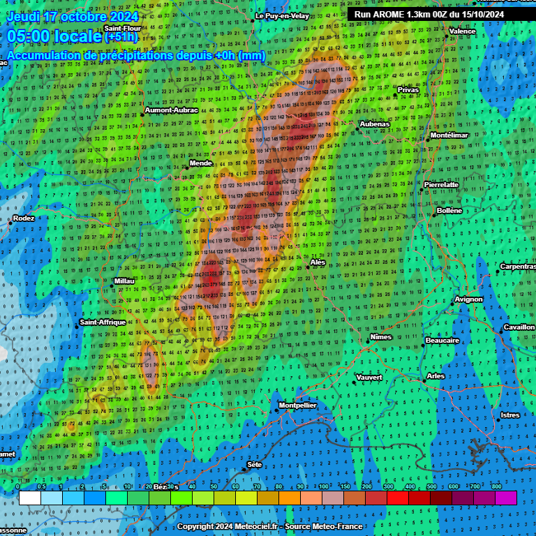 Ce mercredi, les pluies se maintiennent largement sur les reliefs des Cévennes entre l'Espinouse, Caroux, Larzac, limites Gard/Lozère et Ardèche. C'est toutefois sur les Cévennes du Gard, sud Lozère et de l'Ardèche qu'elles sont les plus marquées et les plus durables. On peut déjà avoir d'ici mercredi soir de vastes zones entre 100 et 150 mm, localement 150 à 200 mm sur les zones les plus exposées : sud Aigoual, sud mont Lozère, Tanargue/Bauzon. Sur les plaines, des averses se succèdent dans l'intérieur de l'Hérault et du Gard, entrecoupées d'accalmies. Elles ne sont absolument pas préoccupantes. La carte ci-dessous du modèle ARÔME montre l'accumulation des pluies entre ce soir et la nuit de mercredi à jeudi. On comprend bien pourquoi il s'agit d'un épisode cévenol : les cumuls sont faibles en bord de mer et plaines, mais importants sur les zones de montagne. Les crues débutent à minima sur le fleuve Hérault, les Gardons, la Cèze, le Chassezac, la Baume et l'Ardèche, peut-être Tarn et Vidourle (plus incertain).