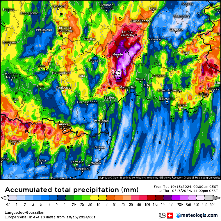Bonne nouvelle : l'anomalie dépressionnaire va favoriser un passage pluvieux entre le Roussillon et l'Aude, d'une intensité modérée, mais avec un arrosage probable de quelques heures. Les pluies vont s'intensifier en fin de journée/nuit de jeudi à vendredi sur les plaines de l'Hérault et du Gard, en devenant parfois orageuses, et en touchant bien évidemment les Cévennes. On peut avoir des intensités proches de 30 mm/1h dans les secteurs les plus touchés, ce qui est loin d'être extrême chez nous, mais cela va se produire sur des sols saturés en Cévennes. Entre la nuit à venir (de mardi à mercredi) et celle de jeudi à vendredi, les cumuls vont atteindre souvent 180 à 250 mm sur les Cévennes du Gard, Lozère et Ardèche, mais avec des pointes maximales de 350 ou 400 mm sur les versants les plus exposés. Cela va engendrer des crues significatives sur le fleuve Hérault et les Gardons, mais aussi entre Chassezac, Baume et Ardèche. Débordements probables dans les zones vulnérables.