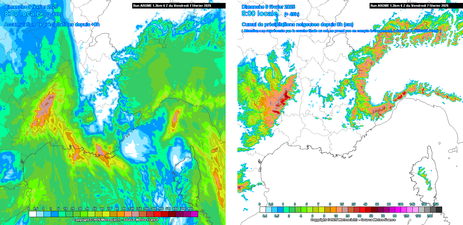 Au niveau des cumuls, la possibilité d’observer en 24h (de vendredi 18h à samedi 18h et en dehors des chutes de neige) 100 - 150 mm sur l’axe Cévenol reste dès lors fortement probable, tandis que les plaines du Gard et de l’est Hérault pourraient enregistrer 50 à 80 mm, contre 20 à 40 mm pour les littoraux comme nous pouvons le constater sur la modélisation présentée ci-dessous à gauche.