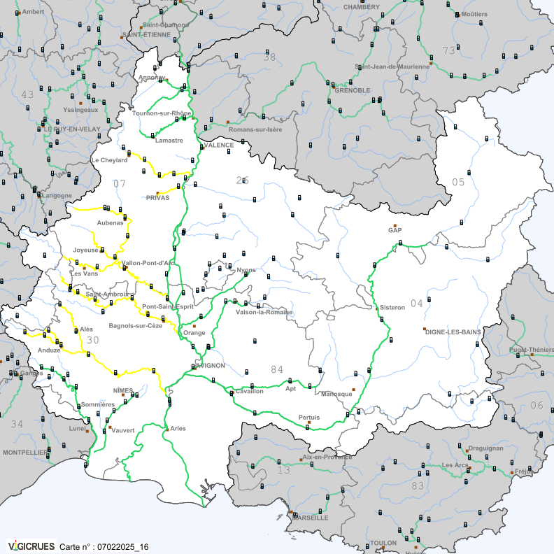 En conséquence, nous surveillerons les réactions modérées qui pourraient se produire sur les cours d’eau exposés du Gard et de l'Ardèche notamment, pour lesquels Vigicrues émet une vigilance de niveau jaune comme indiqué sur l’image ci-dessous. Certains ponts submersibles pourraient ainsi être fermés à la circulation de manière préventive en cours de journée de demain samedi, voire jusqu’à dimanche matin.