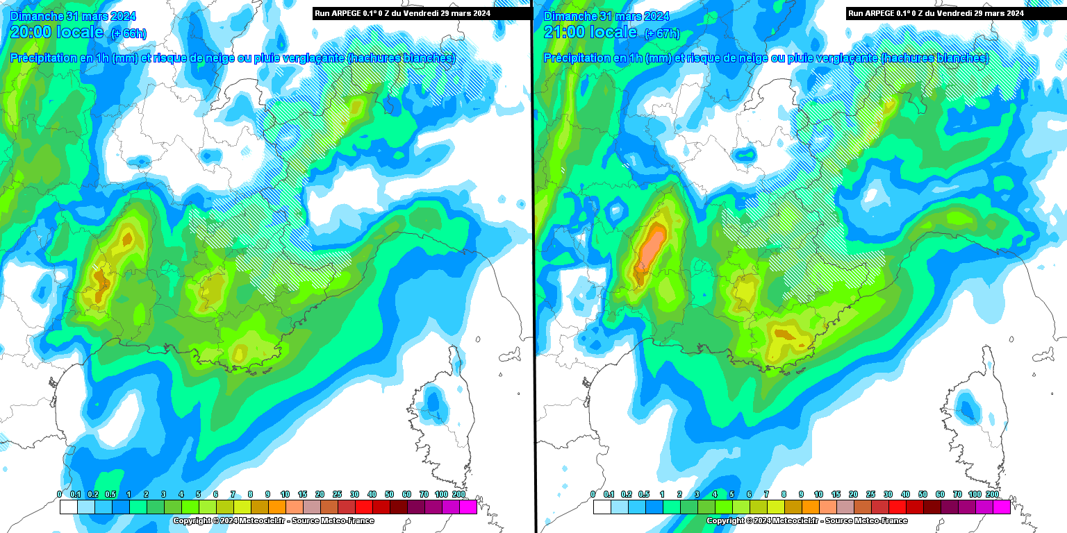 Dans ce contexte, des pluies parfois orageuses sont attendues sur le Gard, les Cévennes, la Lozère et l'Est de l'Hérault entre la matinée et le début d'après-midi. Le passage pluvieux circule rapidement sur le bord de mer (le vent marin repousse les précipitations dans les terres) mais va durer plusieurs heures dans l'arrière-pays et surtout en Cévennes/Lozère. On a temporairement des intensités fortes sur les reliefs (jusqu'à 20 mm/h). Une première salve qui peut donner 30 à 40 mm en Cévennes et localement 40 à 60 mm sur le versant sud de l'Aigoual, du Mont-Lozère et du Tanargue. Sous les orages, du grésil est possible localement, aussi bien en plaines que sur les reliefs.