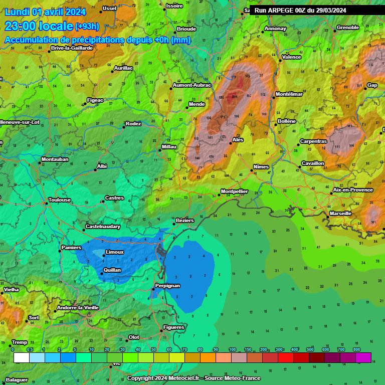 Les cumuls seront très hétérogènes d'un département à l'autre. Sur l'Aude, on prévoit 1 à 3 mm en général, localement 5 à 7 mm sur l'Ouest et le Nord de l'Aude. Même topo sur les plaines du Roussillon : 1 à 4 mm. Les reliefs frontaliers sont "plus exposés" : 5 à 10 mm en général, localement 20 mm. Sur l'Hérault, 5 à 10 mm sur l'Ouest en général (loc. 15 à 20 mm). Sur l'Est de l'Hérault, une fourchette moyenne de 20/30 mm proche de Montpellier et jusqu'à 80/90 mm vers Ganges.
