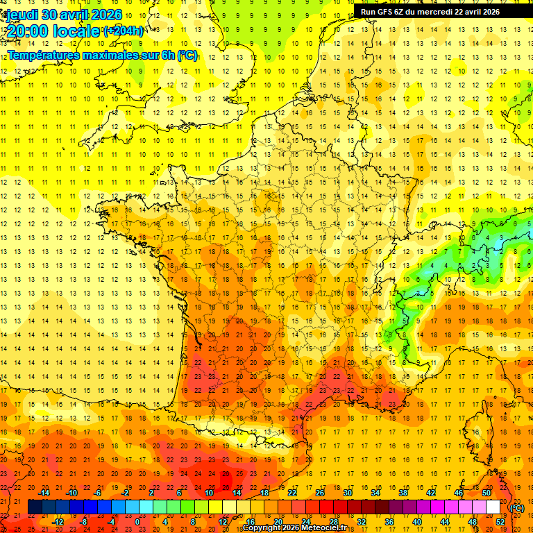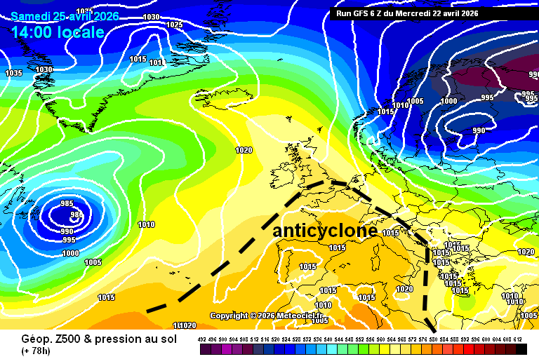 Nous sommes ce mercredi 22 avril 2026 sous l'influence d'un flux d'Est très faiblement dépressionnaire qui explique la petite dégradation en cours et qui va se poursuivre jusqu'à demain jeudi. Notez néanmoins que l'anticyclone est déjà en cours de reconstitution de l'Afrique jusqu'au Royaume-Uni en passant par l'Ouest de la France. Pour la fin de semaine à venir - entre vendredi et le week-end - l'anticyclone va se renforcer tout autour de la France, repoussant les dégradations vers l'Est et le Nord de l'Europe. De l'air doux/modérément chaud va être advecté depuis le Maghreb.