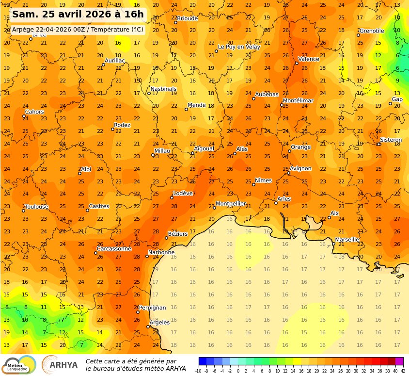 Vendredi : le soleil s'impose partout. Vent d'Autan à 30/50 km/h dans l'Ouest Audois. Partout ailleurs, les brises marines sont faibles. Les températures maximales repartent progressivement à la hausse avec 22 à 24°C en général sur nos plaines, localement 25°C près de la vallée du Rhône. Samedi, du soleil partout en matinée, puis de beaux cumulus bourgeonnent sur les montagnes. Quelques averses orageuses sont attendues du côté des Pyrénées d'une part et d'autre part sur la Lozère, particulièrement entre le milieu d'après-midi et le début de soirée. Il fait chaud avec des températures maximales de 26 à 28°C sur nos plaines et jusqu'à 20 à 22°C dans les vallées Lozériennes. Dimanche, du soleil et encore quelques cumulus l'après-midi cette fois sans orage. Les températures maximales atteignent 28 à 30°C sur nos plaines.