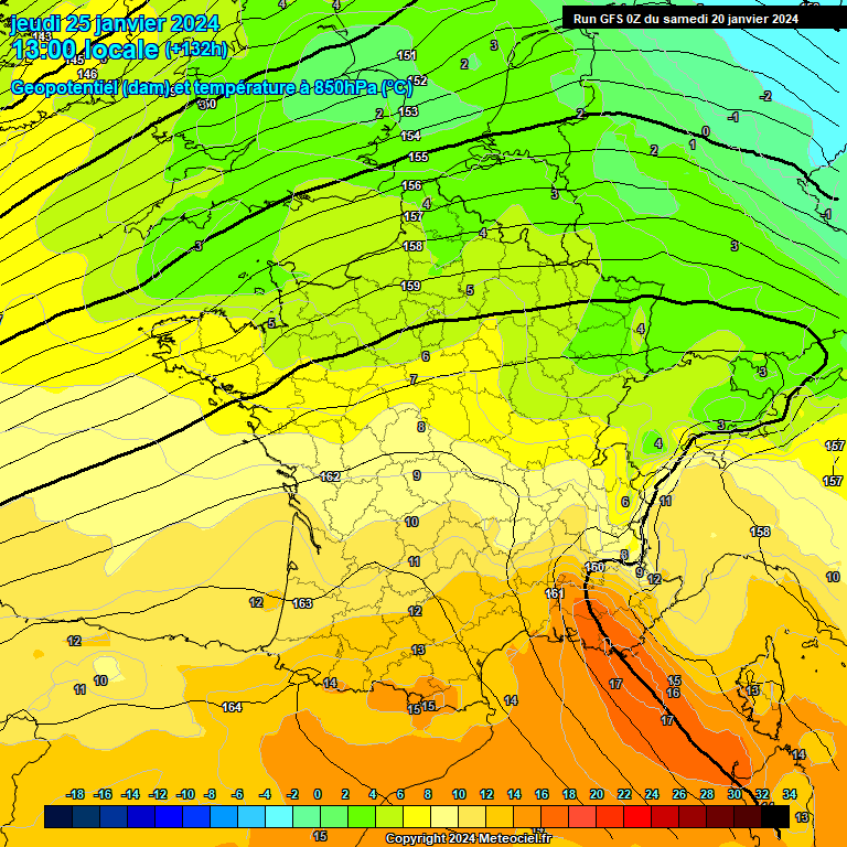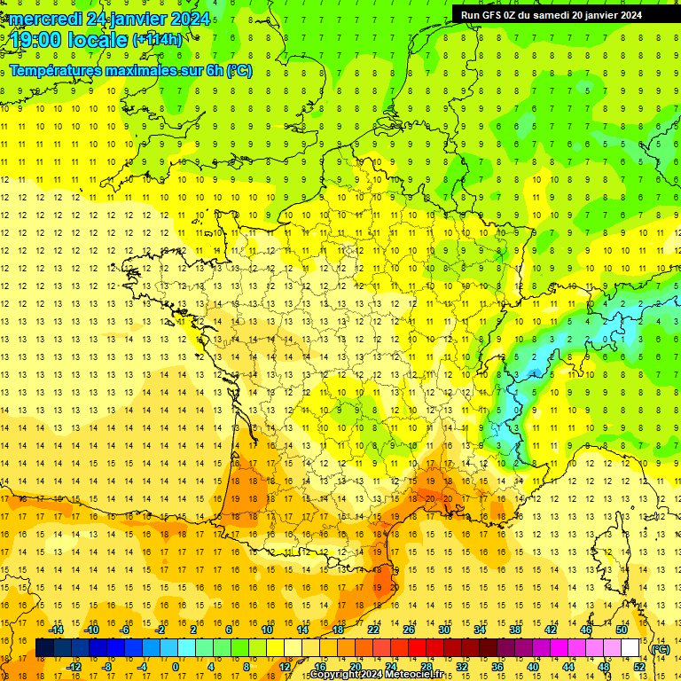 Les valeurs maximales pourraient se situer entre +20 et +22°C sur le Languedoc et potentiellement +22 à +23°C sur le Roussillon. Certains scénarios voient plus encore ! Ces températures vont se situer +10 à +13°C au-dessus des moyennes, ce qui constitue un écart considéré comme exceptionnel il y a encore quelques années. La notion d'exceptionnel n'est plus valable, puisque cela arrive désormais tous les ans. Le modèle GFS ci-dessous - en accord avec les autres - montre les zones les plus chaudes (tout en sous-estimant l'intensité de la douceur). Cette douceur hors norme va persister jusqu'à la fin du mois, puis les températures pourraient commencer à descendre début février mais ce sera à affiner.