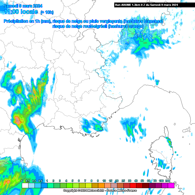 Le caractère orageux restera faible mais on ne peut exclure quelques coups de tonnerre, également sur les reliefs donnant à nouveau un risque d'orages de neige. La neige justement, elle tombera en quantité mais uniquement sur les sommets avec une limite pluie-neige qui aura tendance à remonter en fin de journée. Localement, les intensités neigeuses s'annoncent remarquables. Malgré cette neige, l'amont des bassins cévenols vont se remplir. Conjugués aux fortes pluies en plaines, des crues sont à craindre.