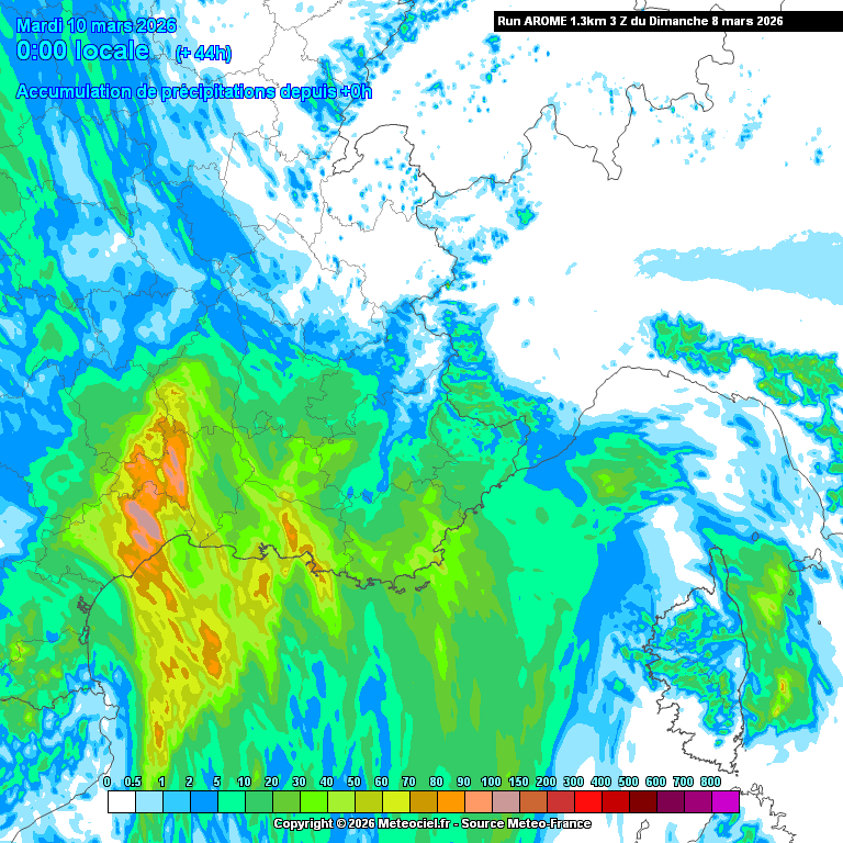 En effet, plusieurs axe pluvio-orageux vont se succéder au cours de ces prochaines 48 heures. D'ici mardi matin, les cumuls pourront être localement importants entre Hérault et Gard comme en témoigne la carte ci-dessous :