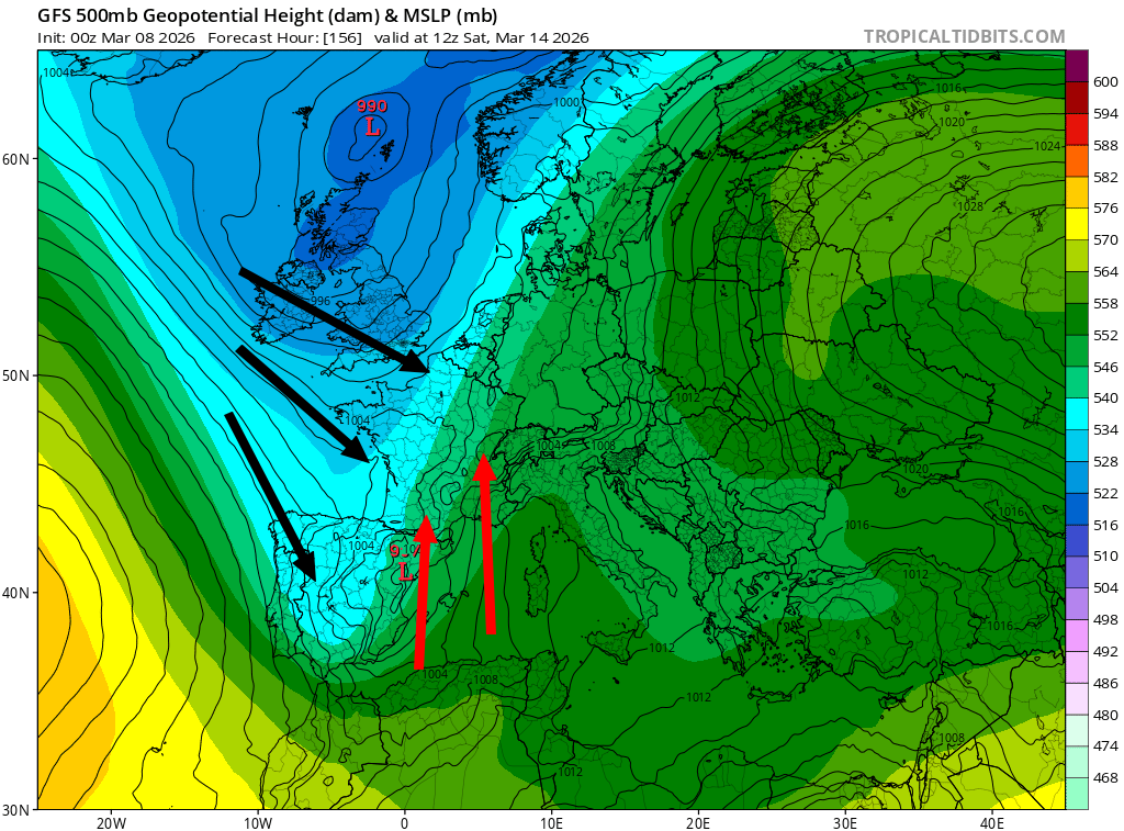 Comme on peut le voir sur la carte ci-dessus, un axe de basses pressions (en bleu) va circuler sur le proche Atlantique et pourrait s'étirer jusqu'en Espagne. Il pourrait apporter de l'air bien plus frais en altitude qui viendrait se confronter à de l'air plus doux et humide drainé à l'avant. C'est cette confrontation thermique qui sera responsable d'une possible dégradation. D'autres scénarios voient l'air frais gagner du terrain avec un temps plus sec avec une baisse des températures. C'est pourquoi la fiabilité reste encore très moyenne pour le moment.