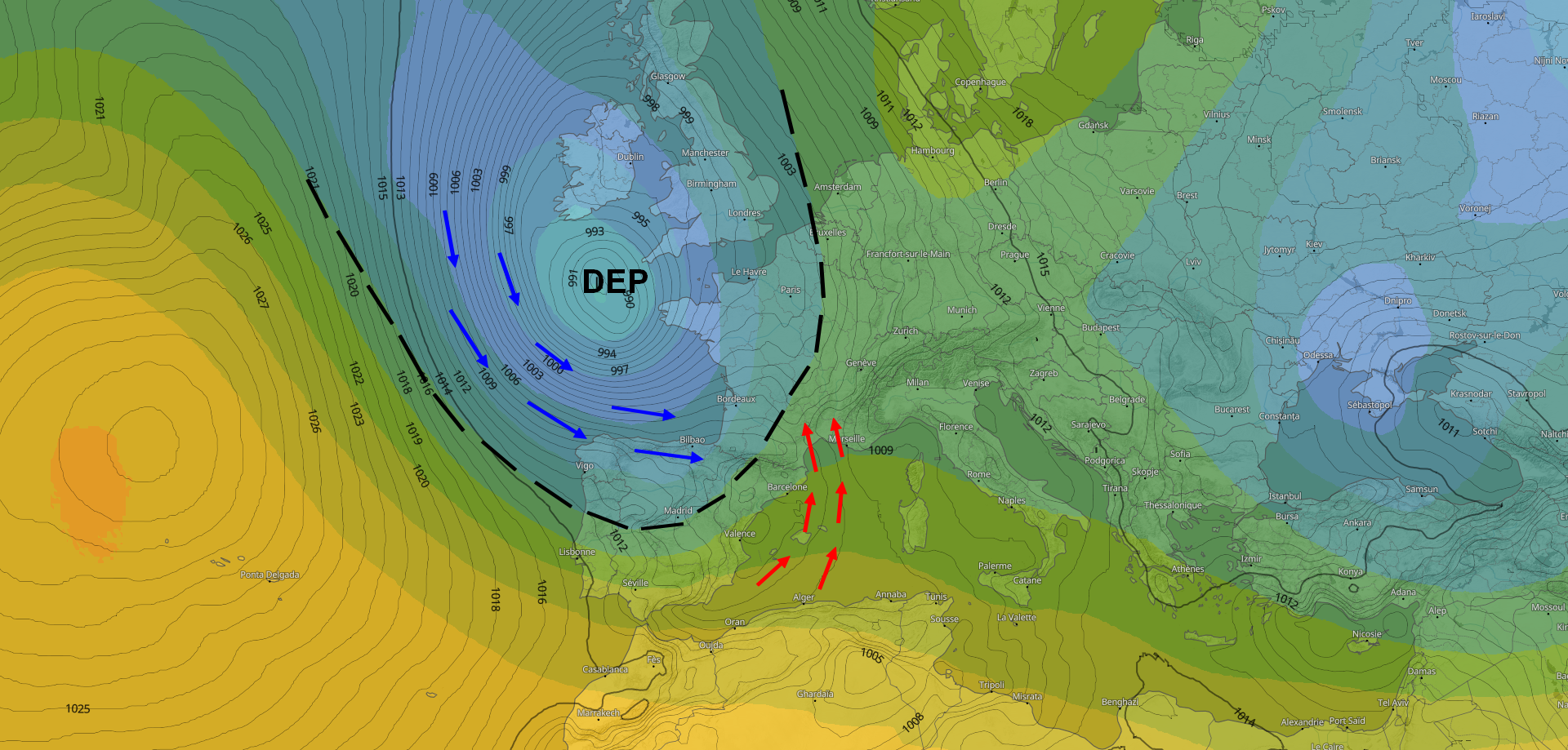 Mardi, un minimum dépressionnaire s'installe près de l'Irlande, avec une pression atmosphérique voisine de 988 hPa. La zone de basses pressions va plonger vers le golfe de Gascogne et le nord de l'Espagne. Cette goutte froide va alors soulever un flux de sud dynamique et chargé en eau précipitable sur toute la Méditerranée, matérialisé par les flèches rouges sur la carte ci-dessous. Il semble que ce système dépressionnaire adopte une faible mobilité entre mercredi et jeudi, ce qui laisse entrevoir une dégradation durable et marquée pour la saison.
