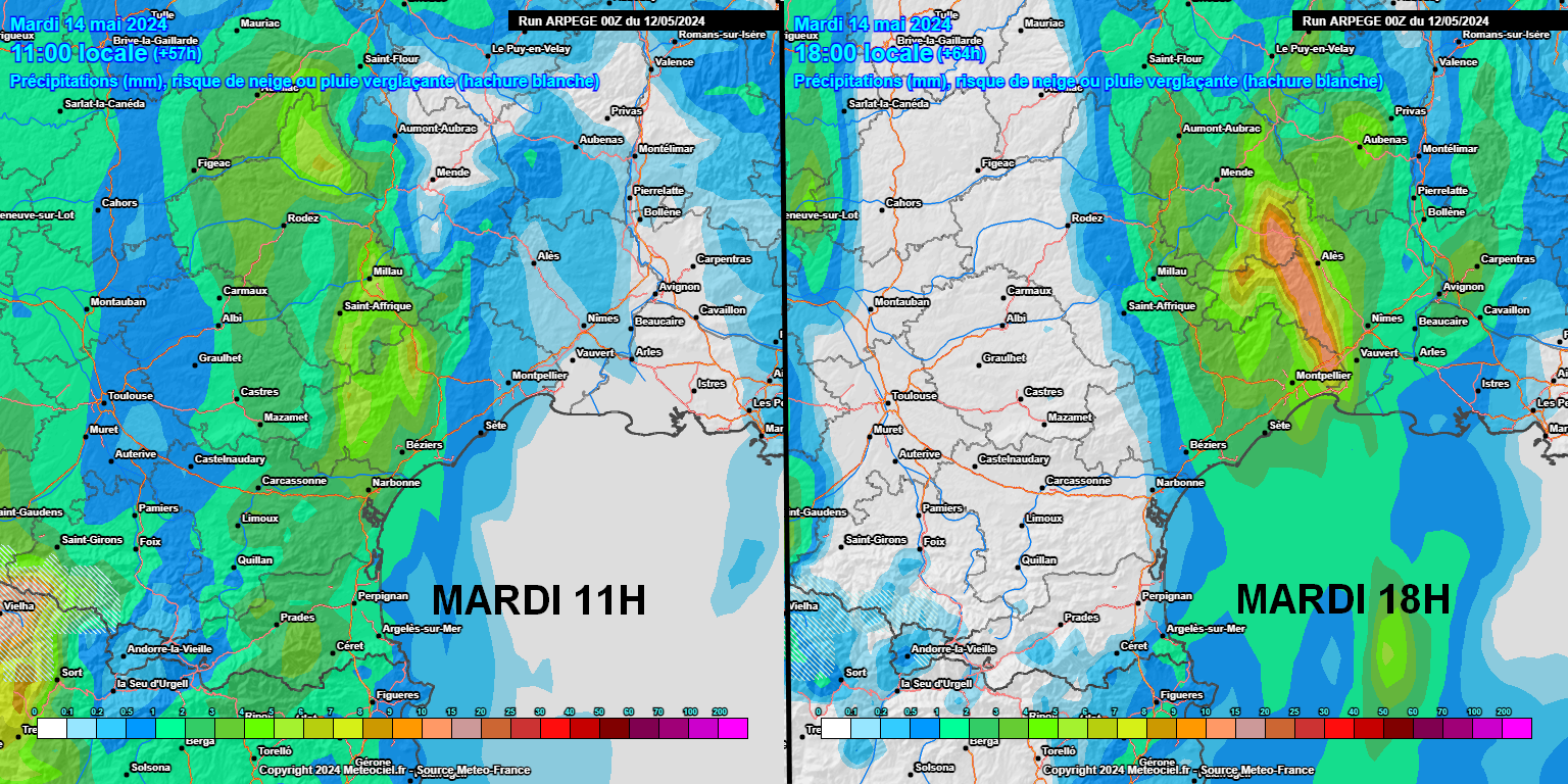 Mardi, le premier forçage dépressionnaire se rapproche de notre région. Le temps devrait se dégrader dès la matinée par les Pyrénées-Orientales et l'Aude, ainsi que sur l'Ouest de l'Hérault, avec la mise en place d'une perturbation pluvieuse généralisée. Mardi après-midi, les précipitations gagnent tout l'Est de l'Hérault, le Gard, les Cévennes et la Lozère, alors qu'elles cessent là où elles étaient présentes en matinée. On peut déjà avoir des pluies copieuses sur ces zones, notamment près des Cévennes mais aussi dans l'arrière-pays du Gard et de l'Est de l'Hérault, avec parfois 30 à 50 mm en peu de temps.