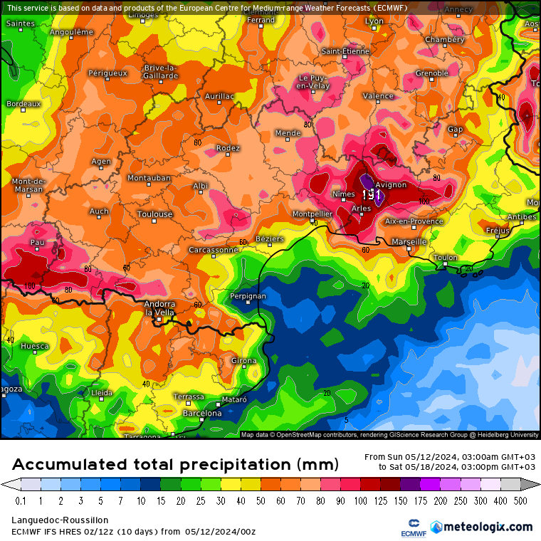 Ces orages pourraient toucher une grande partie de la région mercredi, puis l'activité pluvio-orageuse se limiterait à l'Est du Languedoc jeudi (Gard, vallée du Rhône). Cela sera à affiner. Toutefois, si la prévision mérite encore d'être affinée, la succession de ces épisodes pourrait engendrer des cumuls élevés pour la saison. Certains modèles voient jusqu'à plus de 150 mm en 72h entre l'Est du Languedoc et la vallée du Rhône. Ce n'est pas encore fait mais retenez tout de même que le potentiel pluvio-orageux ne cesse d'être revu à la hausse :