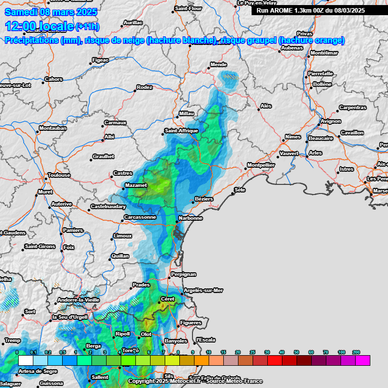Une anomalie dépressionnaire dynamique va arriver par l'Espagne en fin de nuit prochaine du côté des Pyrénées. Elle est couplée à un creusement méso-dépressionnaire en mer Méditerranée. Un cordon pluvieux intense arrive par la chaîne frontalière vers 5h du matin. Les pluies sont marquées et persistent quelques heures sur les Pyrénées-Orientales jusqu'en milieu/fin de matinée. Elles touchent l'ensemble du département et gagnent peu à peu l'Aude en cours de matinée avec là-aussi des intensités soutenues. Il neige autour de 2000 m sur les Pyrénées. Quantités très importantes sur les plus hauts sommets au-dessus de 2500 m.