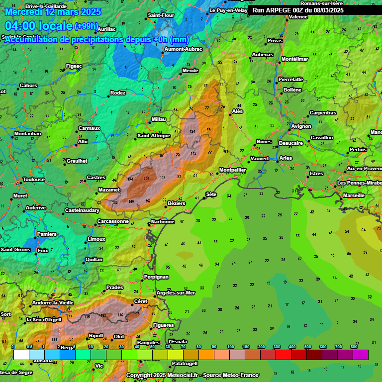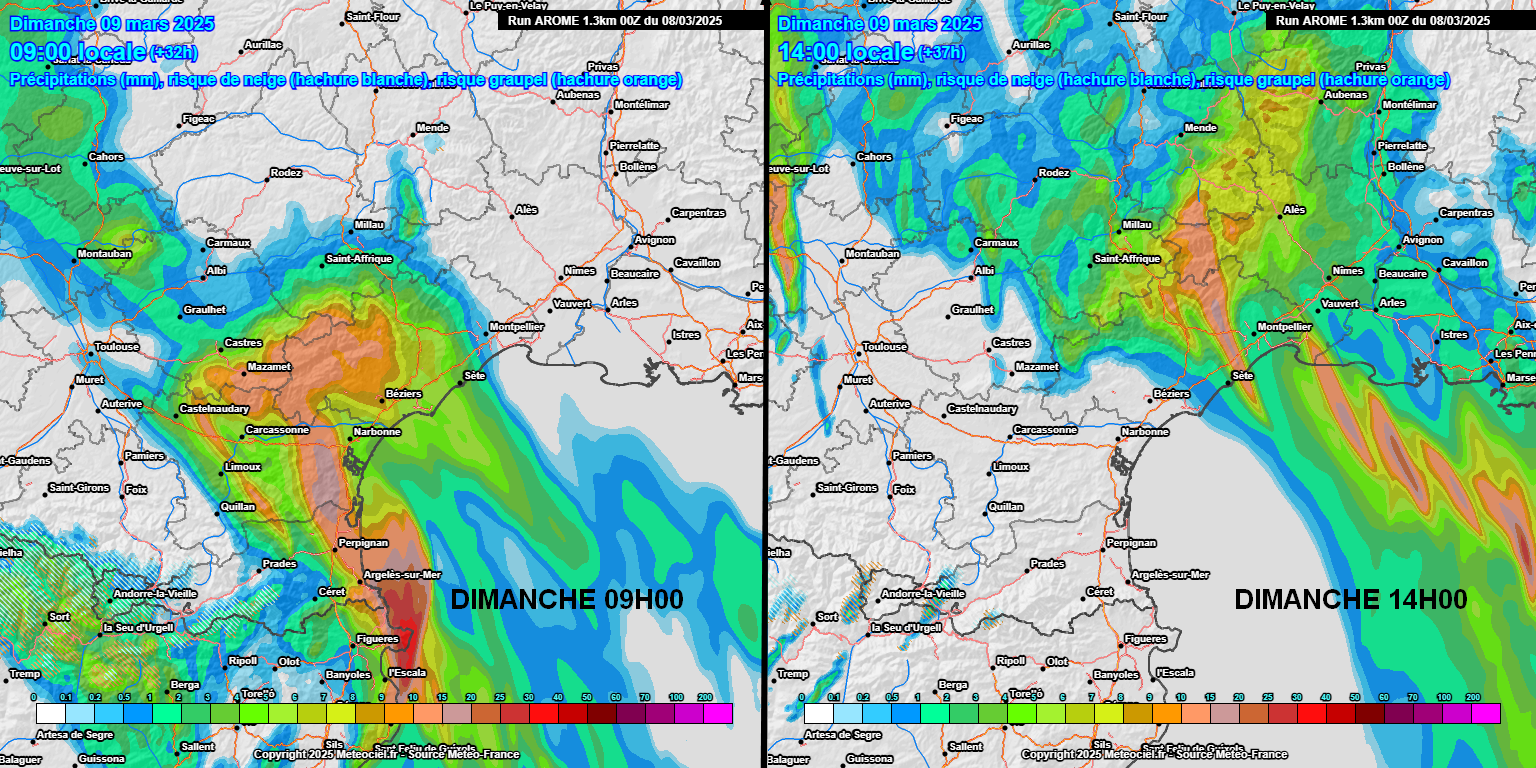 Les cumuls prévus entre ce samedi matin et dimanche soir sont conséquents avec des poches à 150/220 mm sur le Canigou et le bassin du Tech, ou encore sur l'Espinouse/Caroux. On pourrait avoir 100 à 150 mm près de l'Aigoual également. Sur les plaines, 20 à 40 mm entre le Roussillon, l'Aude, l'Est Hérault et le Gard, mais 50 à 80 mm sur l'Ouest Hérault et le long du fleuve Hérault. Les cours d'eau peuvent réagir, dont l'Orb et l'Hérault, sans grave conséquence. Des inondations sont possibles dans les zones saturées et vulnérables, mais d'ampleur très modeste (rassurez-vous). Il peut tomber 1.50 m de neige au-dessus de 2500 m dans les Pyrénées frontalières.