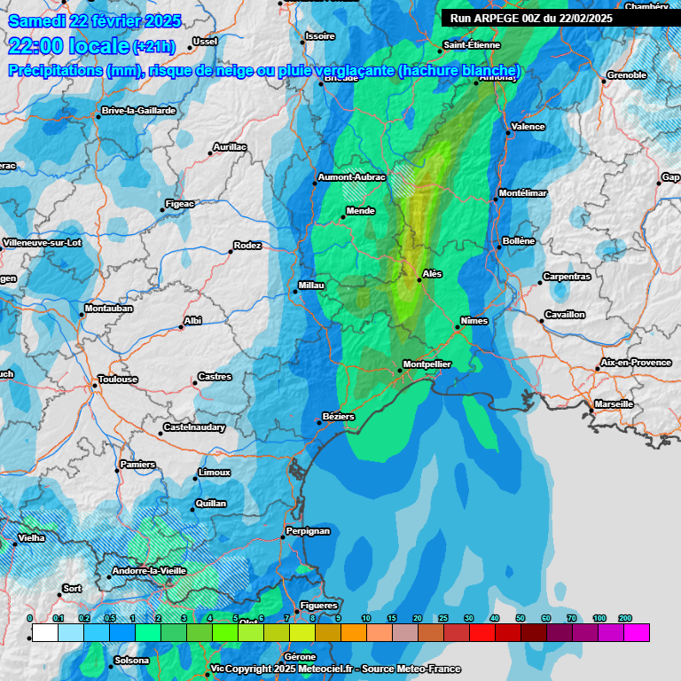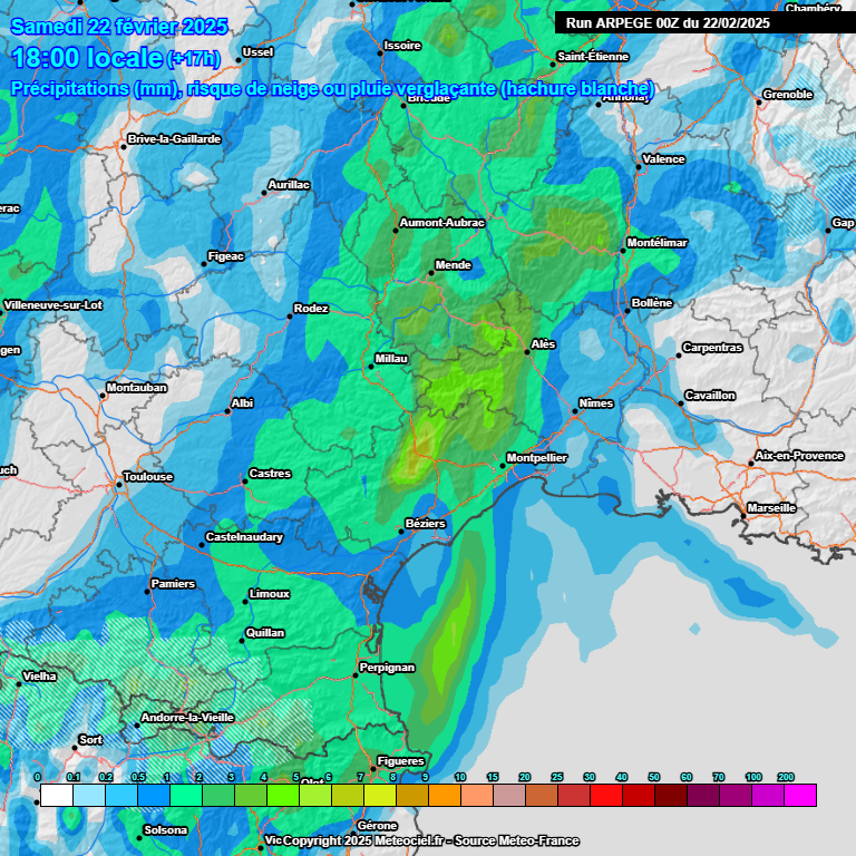 A contrario, la perturbation va s'activer entre l'Est de l'Hérault, l'Ouest du Gard et les Cévennes, où les précipitations sont parfois marquées. Les zones touchées : environs de Montpellier, Pic Saint-Loup, val de Londres, Ganges, Vidourle, Gardonnenque, Vaunage, peut-être même jusqu'au bassin Nîmois et de l'Uzège. La neige est progressivement de retour en Lozère autour de 1500 m dans l'après-midi, et même jusqu'à 1200/1300 m en cours de soirée sur la Margeride. C'est peu significatif, même si quelques cm sont possibles sur le Mont-Lozère.