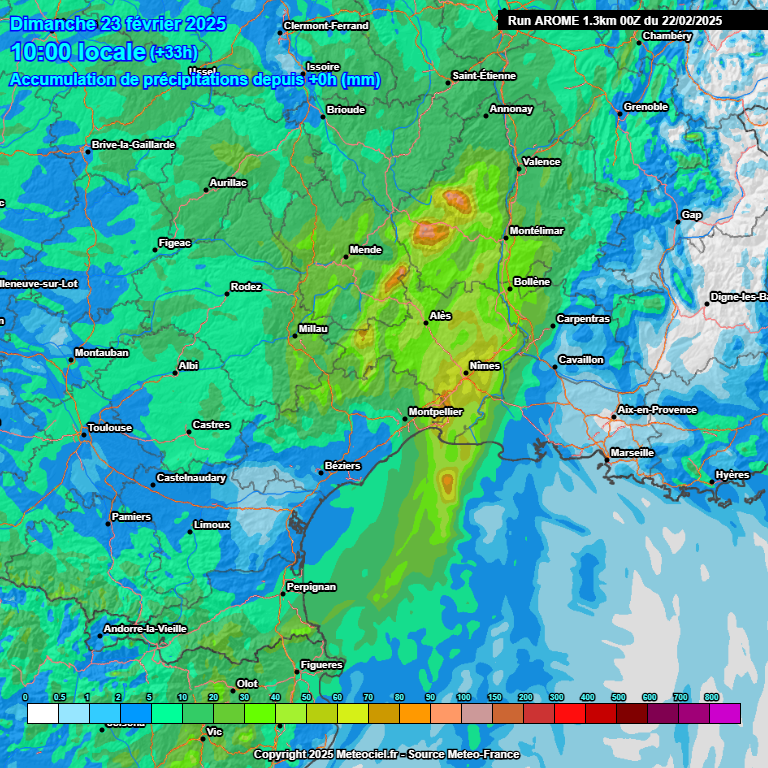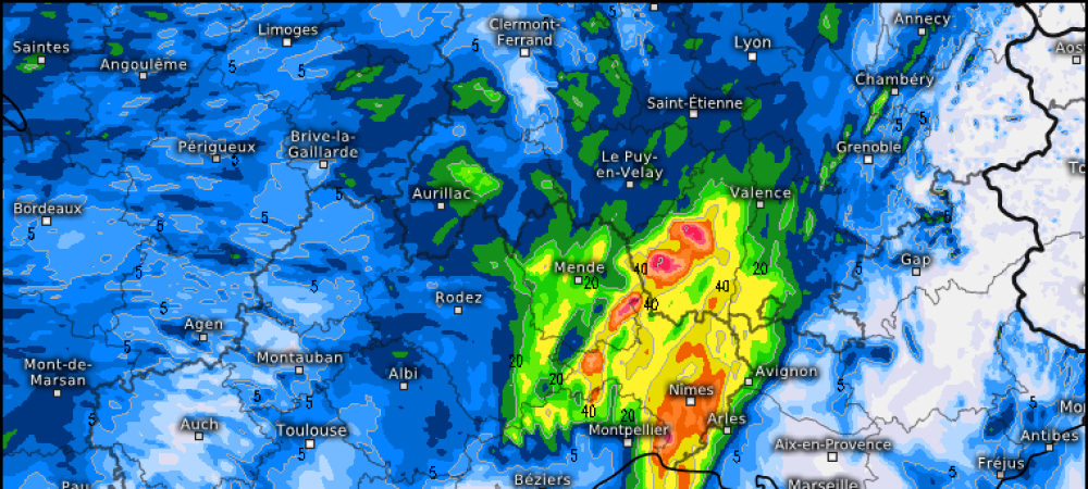 Les cumuls pourront atteindre 30 à 50 mm sur les plaines du Gard et de l'Est Hérault, mais plus de 100 mm sur les Cévennes du Gard, de la Lozère et de l'Ardèche, localement 120/140 mm sur le Tanargue. Cette situation est ordinaire, mais ces cumuls se produisent dans les zones déjà saturées par les précédentes pluies.