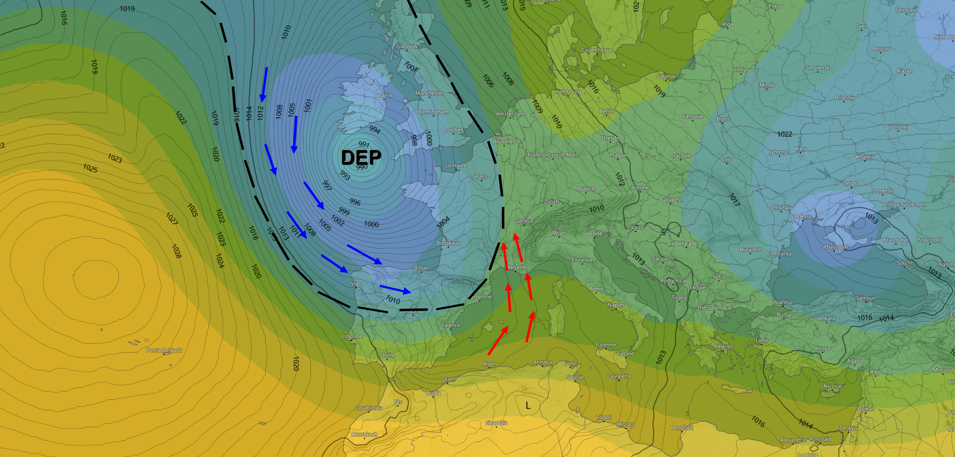 L'anticyclone se rétracte actuellement en direction de l'Afrique. On profite ce lundi d'éclaircies sur une partie du Languedoc et du Roussillon, mais elles ne vont pas durer. Une goutte froide dépressionnaire très active se dirige actuellement vers l'Irlande, avec une pression atmosphérique inférieure à 990 hPa. Elle prolonge son influence en direction du golfe de Gascogne et le nord de l'Espagne, avec une faible mobilité. Ce contexte atmosphérique va favoriser la mise en place d'un flux de sud durable, drainant de la douceur et de l'eau précipitable dans la masse d'air.