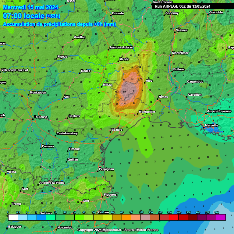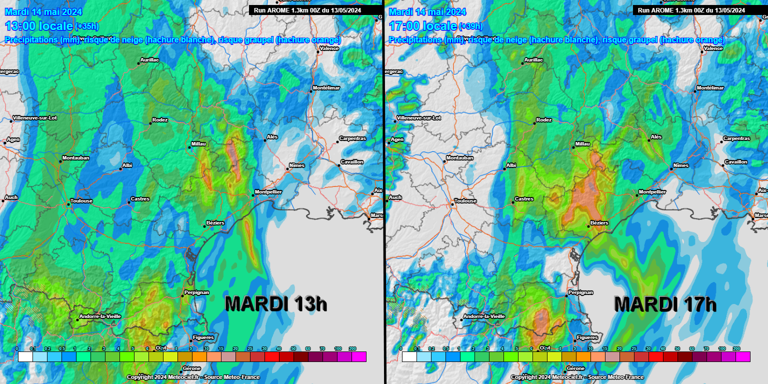 L'épisode à venir s'annonce conséquent pour une mi-mai ! C'est probablement l'Aude qui aura les cumuls les moins élevés ainsi que le nord du Roussillon, même si on y prévoit souvent 10 à 15 mm et localement 20 mm. On peut avoir 20 à 25 mm près de Narbonne et 30 à 35 mm sur les reliefs frontaliers, entre Cerdagne, Canigo, haut Vallespir, Albères et Vermeille. Sur l'Hérault, il pourrait tomber 20 à 40 mm sur l'Ouest du département, entre le Biterrois et le Minervois, localement 50 à 60 mm en se rapprochant des reliefs proches du Caroux.