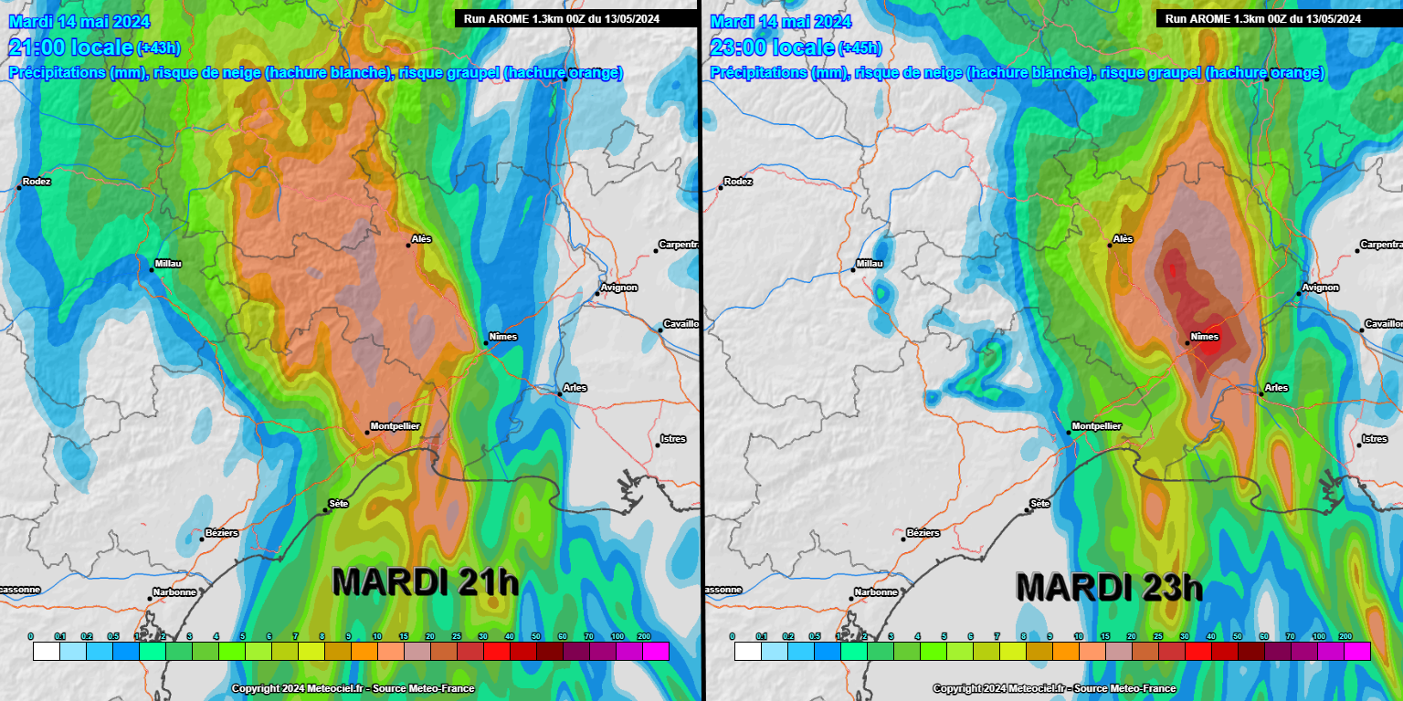 De fortes pluies orageuses pourraient se produire au moins temporairement entre Montpellier, Pic Saint-Loup, Val de Londres, Larzac, Aigoual, Vidourle, Gardonnenque, Vaunage puis plus tardivement le soir entre le bassin Nîmois, la vallée du Rhône, l'Uzège et les gorges de la Cèze. Certains modèles de prévisions voient alors des intensités de 30 mm/1h, s'ajoutant aux pluies déjà tombées précédemment. Cette ligne pourrait être intense, mais toutefois et HEUREUSEMENT mobile. Elle est bien visible sur le modèle Arôme ci-dessous :