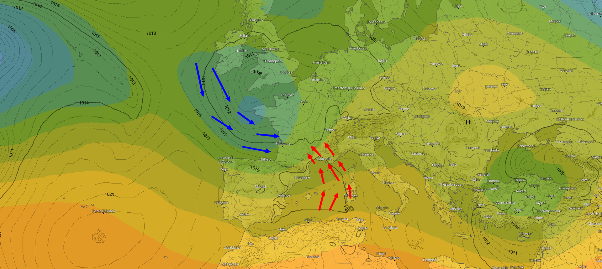 L'épisode débute timidement en cette mi-journée. Nous sommes actuellement sous l'influence d'une goutte froide dépressionnaire qui commence à se dynamiser au large de la Bretagne, donc sur le proche Atlantique. Sa phase de dynamisation est corroborée par la levée progressive des brises marines près du bord de mer. Le flux bascule peu à peu au secteur Sud-Est dans les basses-couches de l'atmosphère, alors qu'il est plutôt orienté à l'Ouest dans les hautes couches.