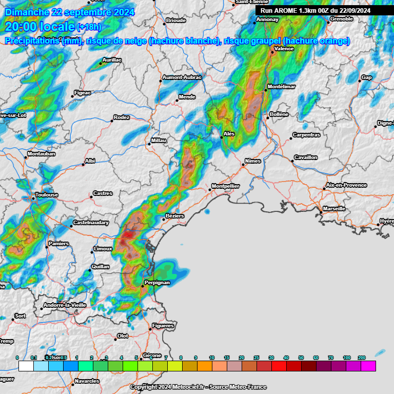 Des orages vont se former autour de 16/18h sur les Pyrénées-Orientales, l'Aude et plus localement l'Hérault. Peu à peu, ils se structurent en une ligne qui balaie d'Ouest en Est le Roussillon et l'Aude, avec parfois des phénomènes assez marqués entre Minervois / Corbières et Salanque (fortes pluies possibles, ou chutes de petite grêle). Il peut localement tomber 40/60 mm sur ces zones (caractère très ponctuel des forts cumuls). Le caractère d'averses persiste ailleurs, plus marqué près des Cévennes. En début de soirée, l'axe orageux peut donner de fortes pluies entre le littoral du 66/11 et l'Ouest Hérault. Des cellules orageuses commencent aussi à se développer dans l'intérieur de l'Hérault et du Gard, où l'instabilité va croître dans la nuit. Épisode assez actif mais plutôt bref entre Roussillon, Aude et Ouest Hérault, avec évacuation d'ici el milieu de soirée au plus tard. On voit cette première phase sur le modèle Arôme ci-dessous :