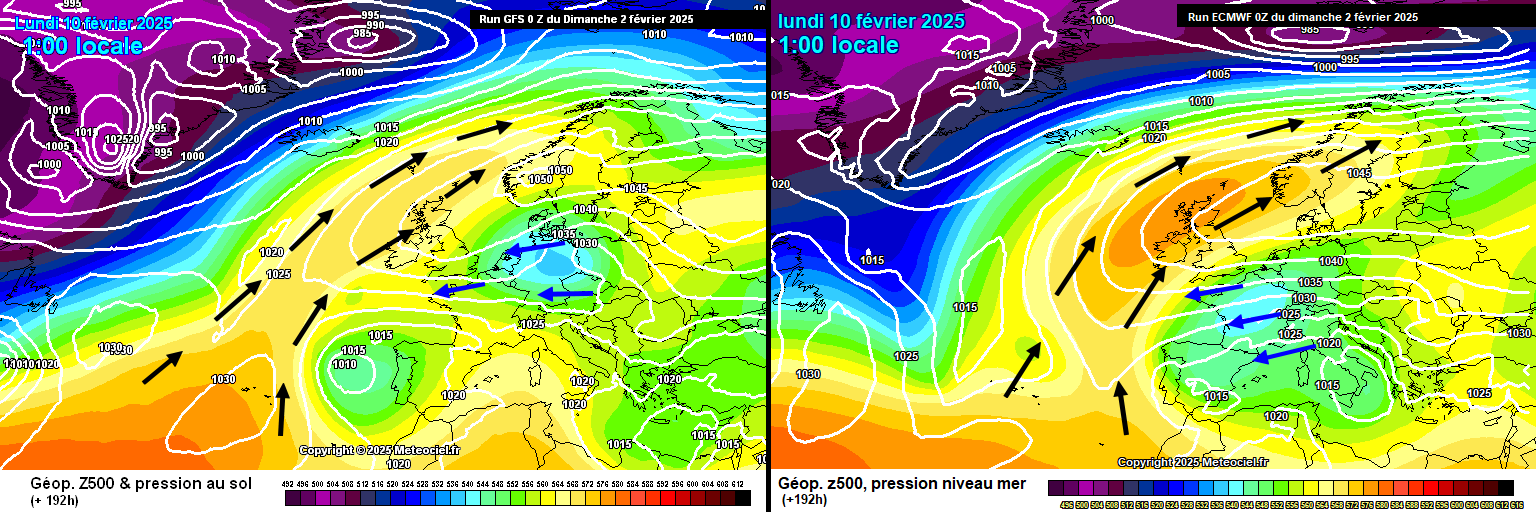 A compter de jeudi, l'anticyclone se redresse rapidement vers l'Angleterre et entre vendredi/week-end prochain, ces hautes pressions migrent vers la Scandinavie. Un AS (Anticyclone Scandinave) pourrait se former favorisant la mise en place d'un flux d'Est sur l'Europe. Comme nous le disons souvent dans nos articles : l'important va être de savoir quel dynamisme va être associé à ce flux d'Est ? Les anomalies vont-elles nous atteindre ? Cela devient une option plausible car évoquée par la plupart des modèles. Ci-dessous, comparaison entre GFS (à gauche) et CEP (à droite) :
