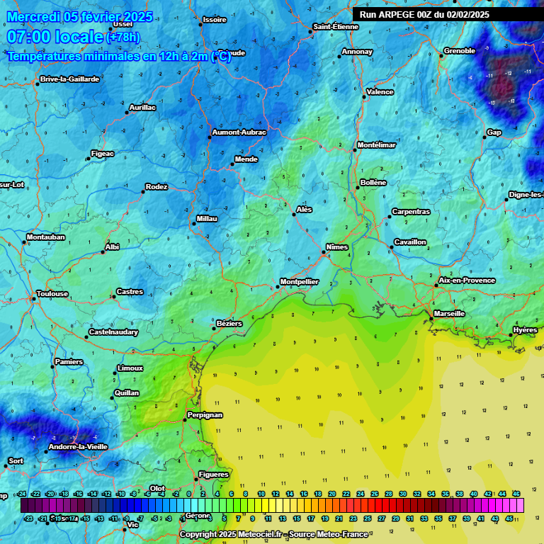 Entre ces zones, le vent s'annonce plus faible. Dans ce contexte, la dynamique des inversions thermiques va reprendre dans les zones peu ventées avec des gelées attendues notamment : sur les plaines de l'Ouest Gard (Vidourle/Gardonnenque) et de l'Est Hérault (Montpellier, Saint-Loup, Val de Londres) ou encore sur le Biterrois/Minervois ainsi que des Albères au Conflent dans les Pyrénées-Orientales. Sur ces zones, il fera très doux en journée avec souvent 13 ou 14°C. Là où le vent souffle, les minimales sont plus douces, autour de +3/+5°C mais les maximales sont par contre plus fraîches, autour de +10°C. En soit, rien de bien extraordinaire !