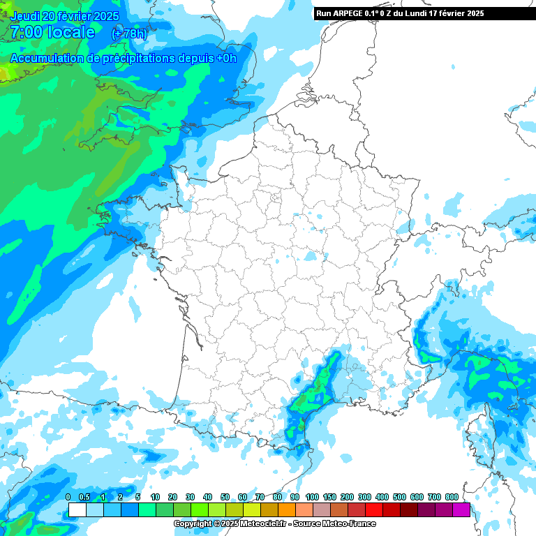 Ci-dessus, la carte représente l'accumulation de pluies entre ce lundi et jeudi matin. On remarque qu'une grande majorité du pays est en blanc, ce qui signifie que l'on attend un temps sec. Quelques traces de petites pluies sont possibles en Bretagne mais là où la modélisation de pluie est la plus probable, c'est bien sur notre région. En effet, sous les entrées maritimes, de la bruine ou des petites pluies sont attendues ce mercredi.