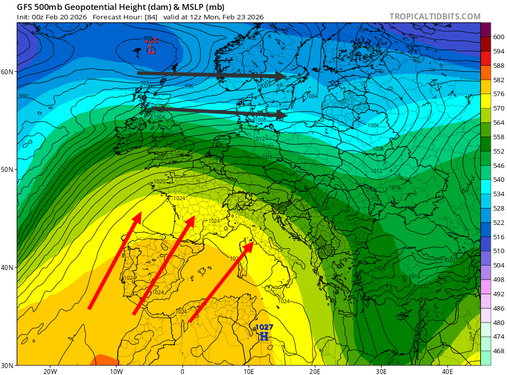 Cette douceur nous amènera très largement au-dessus des moyennes de saison mais nous resterons sous les records mensuels récemment battus avec 23 à 25°C. Des doutes sont présents sur la durée de cette période anticyclonique. Certains modèles voient la reprise de conditions plus dépressionnaires dès la deuxième partie de semaine tandis que d'autres font davantage durer cette période calme. D'une manière générale, la remontée de cet anticyclone coupe l'alimentation Océanique et apporte une accalmie nécessaire sur le risque d'inondations sur notre pays.