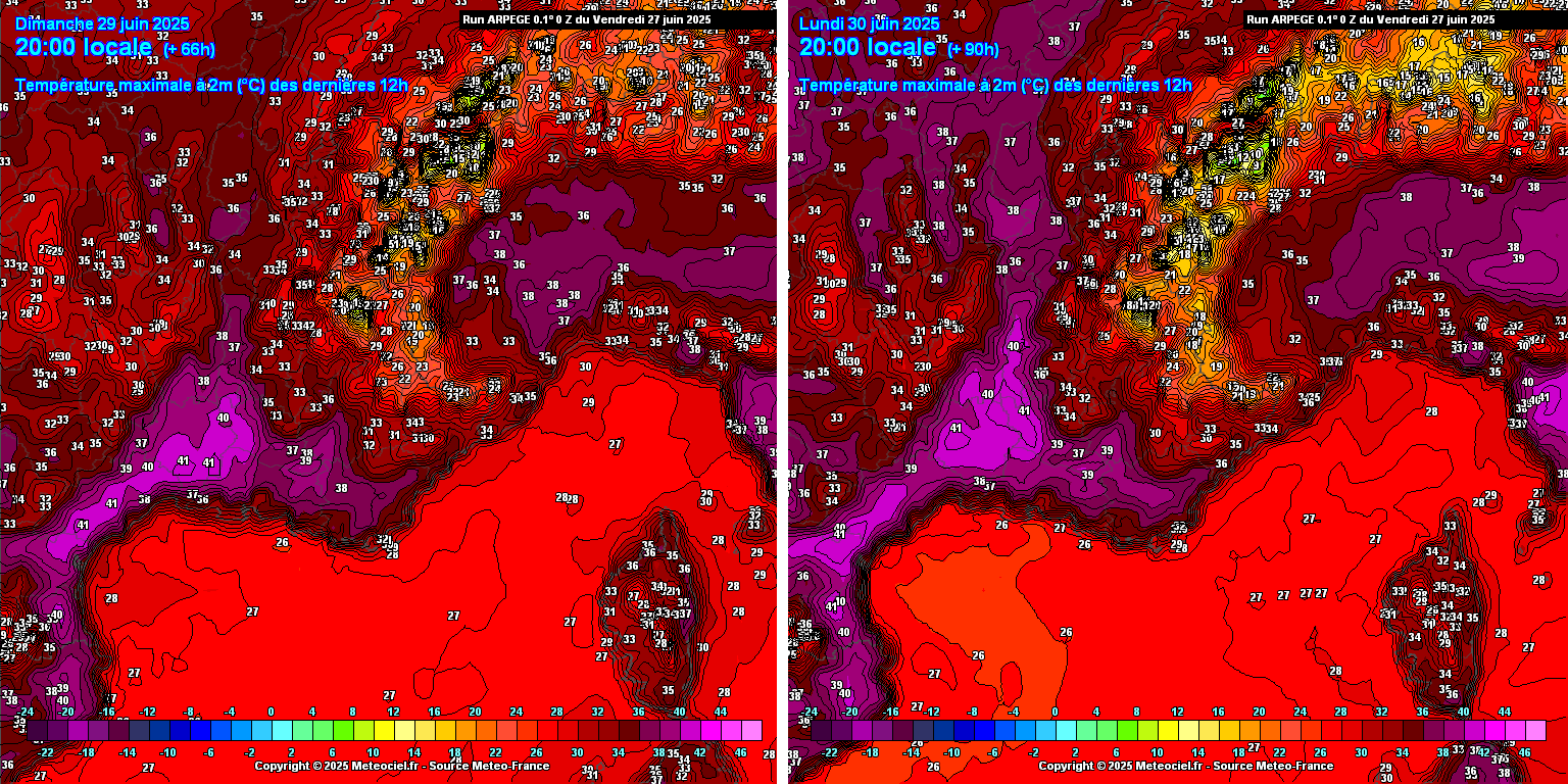 Dès ce samedi, la barre des 40°C est possible localement à la convergence des vents. Les 40°C sont encore plus probables et étendus ce dimanche. Ces maximales sont attendues dans l'intérieur des terres avec des littoraux à peine plus tempérés par le vent marin bien qu'avec une température de la mer élevée, l'effet marin sera atténué. Lundi, la situation restera figée si ce n'est que les 40°C pourraient reculer davantage dans l'arrière-pays.